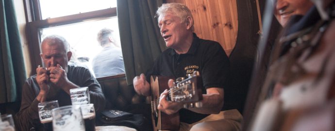 Someone spontaneously starts to sing, while the rest of the people listen in silence.